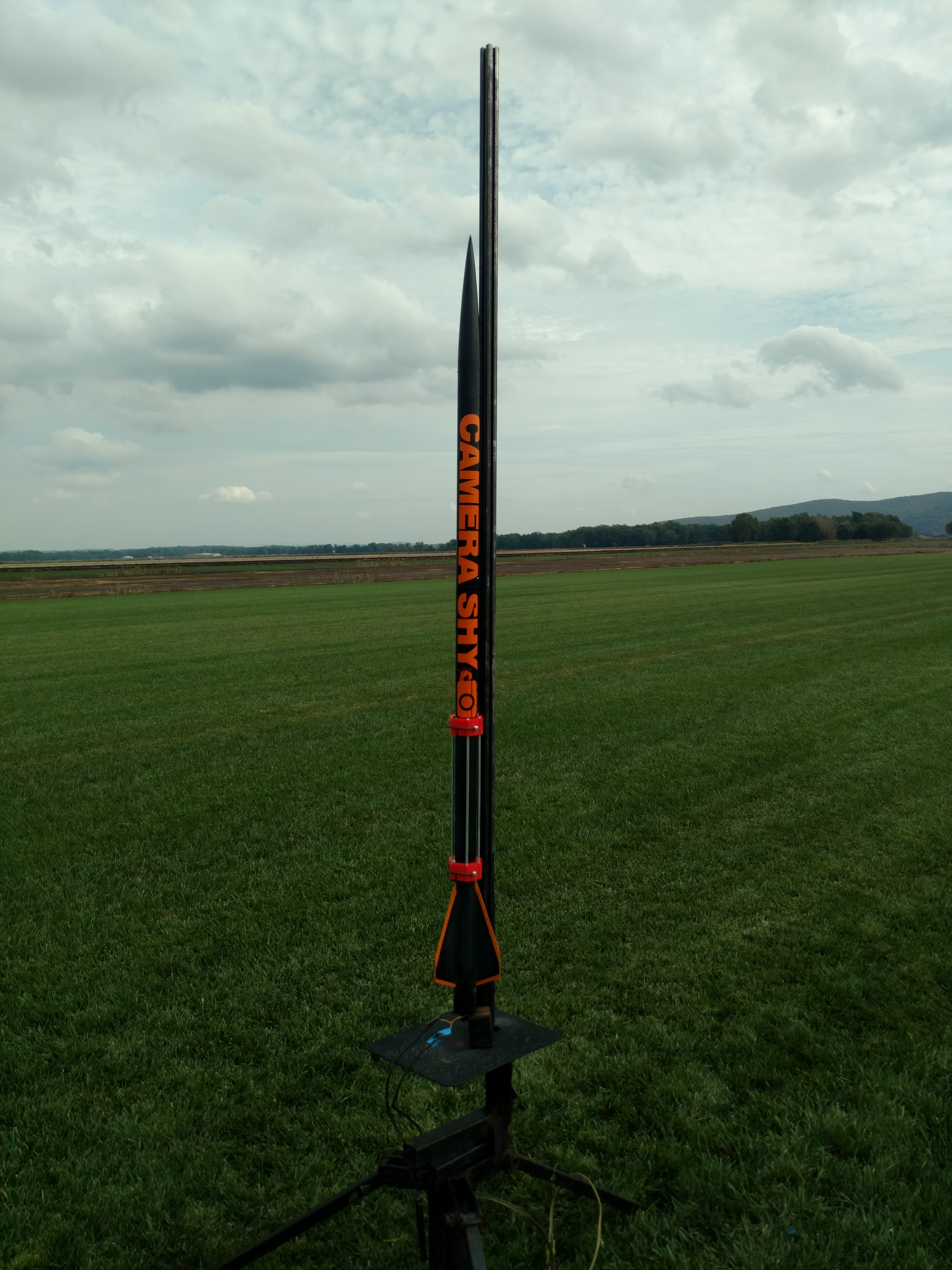 The flight went well, however the tape holding the motor in let go instead of the shear pins resulting in a lawn dart from 300 meters, only to be saved by the main chute poping at 500 feet. The other problem was that I did not have enough recovery wadding which resulted in the parachute getting toasted.