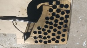 For casting the half balls, I used a router bit to make round cutouts in a piece of wood and mixed up some silicone to form them. Black acrylic paint was used to color the silicone.
